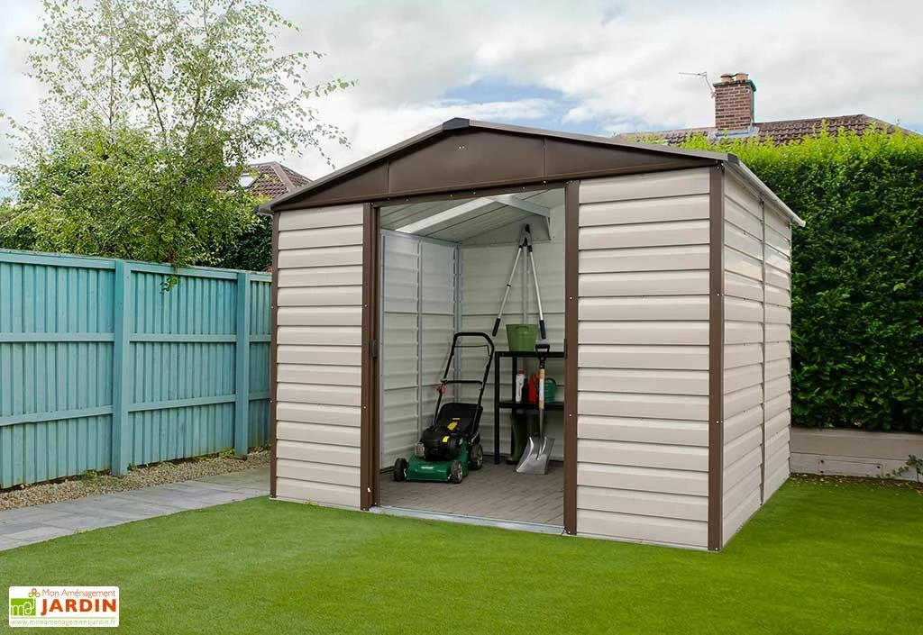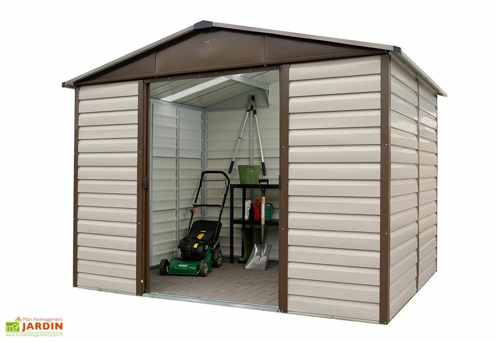 L’abri en métal est marron et beige et s’intègre parfaitement à votre jardin. Il est équipé d’une grande double porte coulissante de 120 cm de largeur et de 178 cm de hauteur.