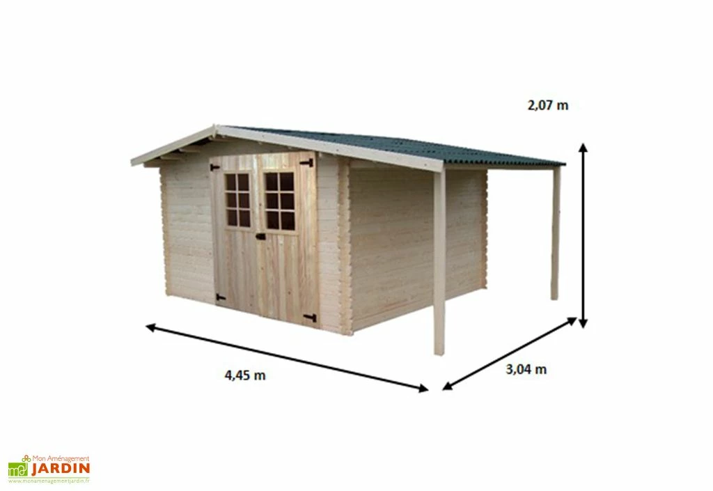 Avec des dimensions hors-tout de 3,04 x 4,45 m, ce cabanon de jardin occupera une surface de 13,53 m² une fois monté. Il offre un espace intérieur de 8,68 m², soit suffisamment de place pour ranger du matériel de jardinage, des outils ou pour placer des vélos à l’abri des intempéries, entre autres. Sa double porte avec lucarne de 1,60 m de large sur 1,69 m de haut permet d’accéder aisément à l’intérieur de l’abri.