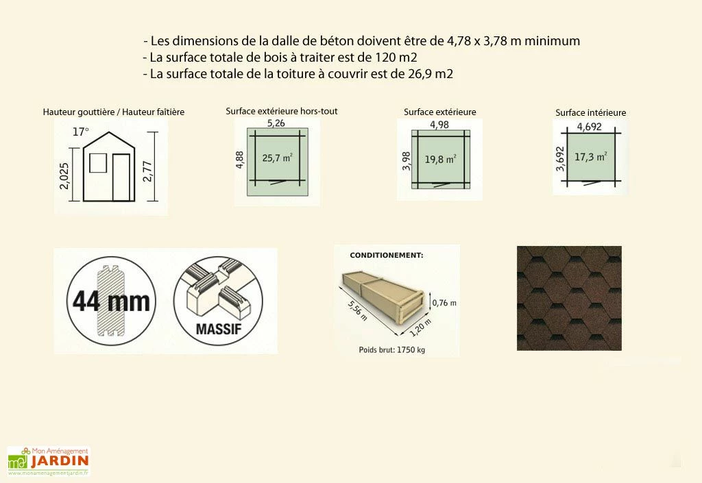 La toiture de l’abri de jardin est en bois massif de 18 mm recouvert de bardeaux bitumineux. Les solives sont traitées et le plancher est fournis. Votre abri doit être installé sur une chape de béton ou sur des plots, non fournis. Les dimensions extérieures hors tout sont de 4,88 x 5,26 m (l,l). Les dimensions extérieures de l’abri sont de 3,98 x 4,98 x 2,77 m (l,l,h). Les dimensions intérieures sont de 3,69 x 4,69 m (l,l), pour une surface utile de 17,3 m².