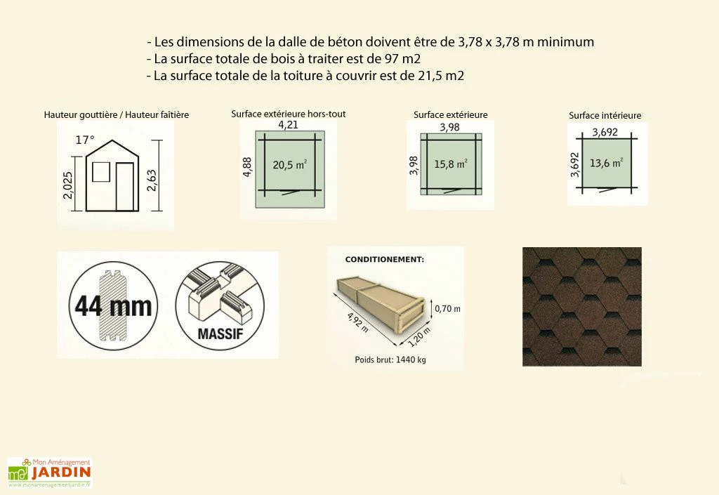 Votre chalet en bois est équipé d’un système anti-tempête réalisé par des tiges filetées métalliques. La toiture de l’abri de jardin est en bois massif de 18 mm recouvert de bardeaux bitumineux. La surface de toiture à couvrir est de 21,5 m². Le plancher est fournis. Votre abri de jardin doit être installée sur une chape de béton ou sur des plots, non fournis.