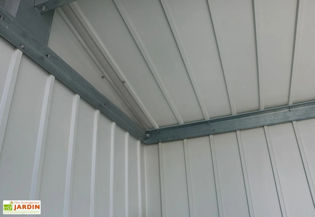 La cabane en métal dispose d’une toiture en pente et mesure 2,29 m de hauteur à l’avant et 1,88 m de hauteur à l’arrière. La hauteur intérieure à l’avant de l’abri est de 2,22 m. L’avancée de toit Skylight permet d’offrir un puits de lumière naturelle à l’abri.