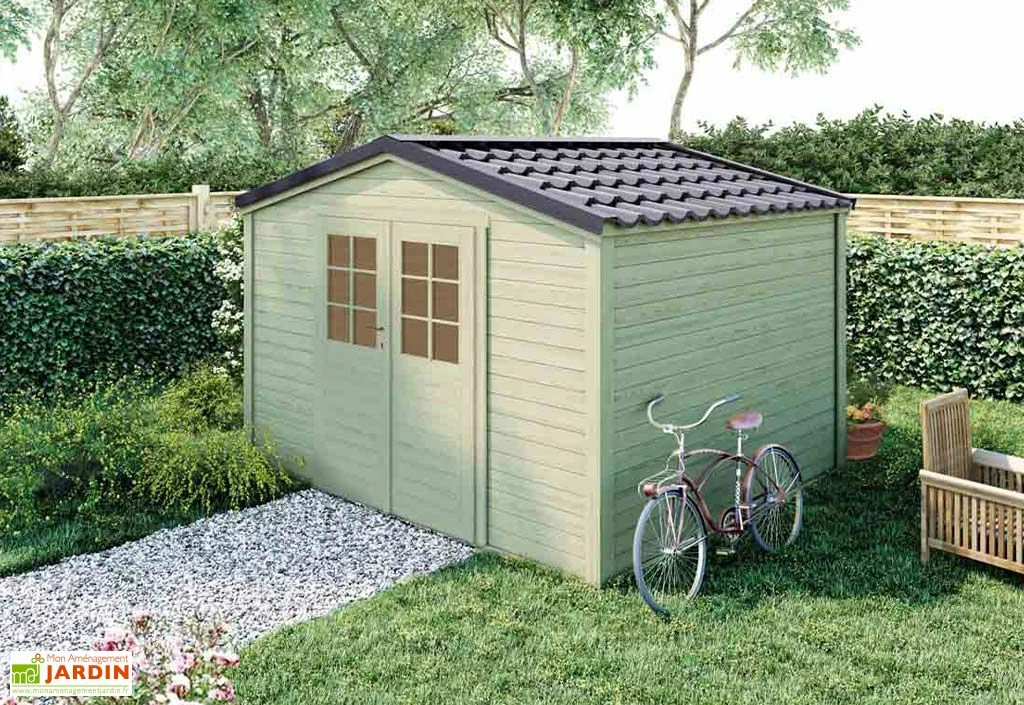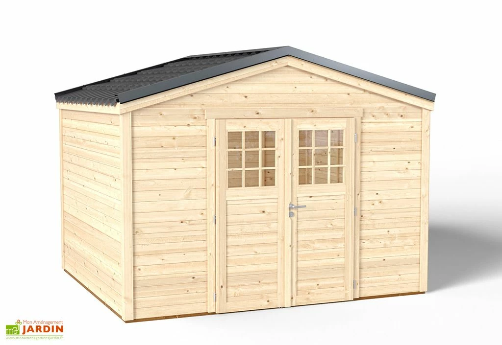 Avec des dimensions extérieures de 3,30 x 2,80 m, cet abri de jardin occupe une surface au sol de 9,2 m², pour un espace intérieur de 8,9 m². Ses parois sont composées de madriers de 28 mm d’épaisseur qu’il vous faudra emboîter et fixer au niveau des poteaux d’angle, pour une meilleure stabilité des murs. Ce cabanon de jardin dispose également d’une grande double porte de 1,50 m de large pour 1,85 m de haut. Cette porte est équipée de vitres qui se chargeront d’apporter un peu de luminosité à l’intérieur de l’abri.