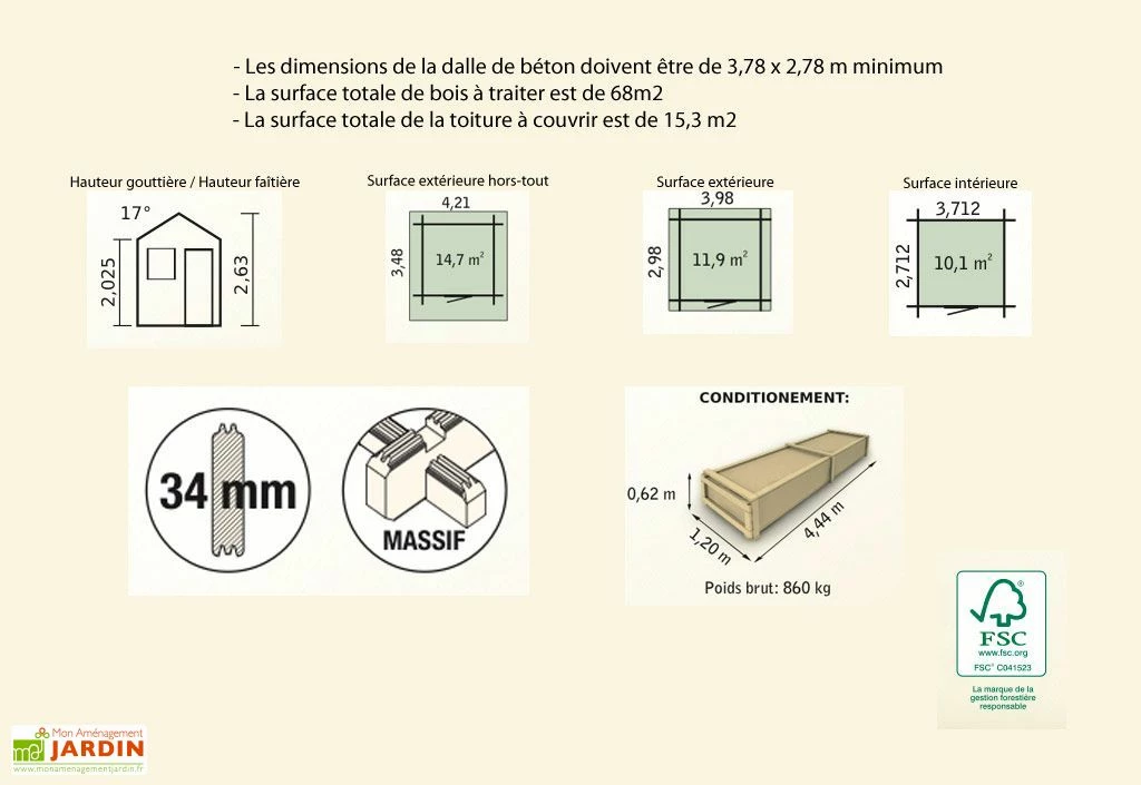 Vous pouvez installer votre chalet en bois sur une dalle ou sur des plots de béton. Les dimensions extérieures hors tout sont de 4,21 x 3,48 m. Les dimensions extérieures de l’abri sont de 3,98 x 2,98 x 2,63 m et l’intérieur mesure 3,71 x 2,71 m, pour une surface utile de 10,1 m².