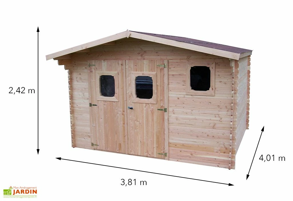 - Surface totale : 15,28 m² – dimensions hors tout : 3,81 x 4,01 x 2,42 m (l x p x h)