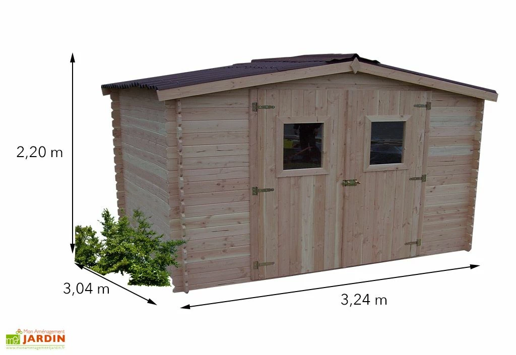 - Surface totale : 9,85 m² – dimensions hors tout : 3,24 x 3,04 x 2,20 m (l x p x h)