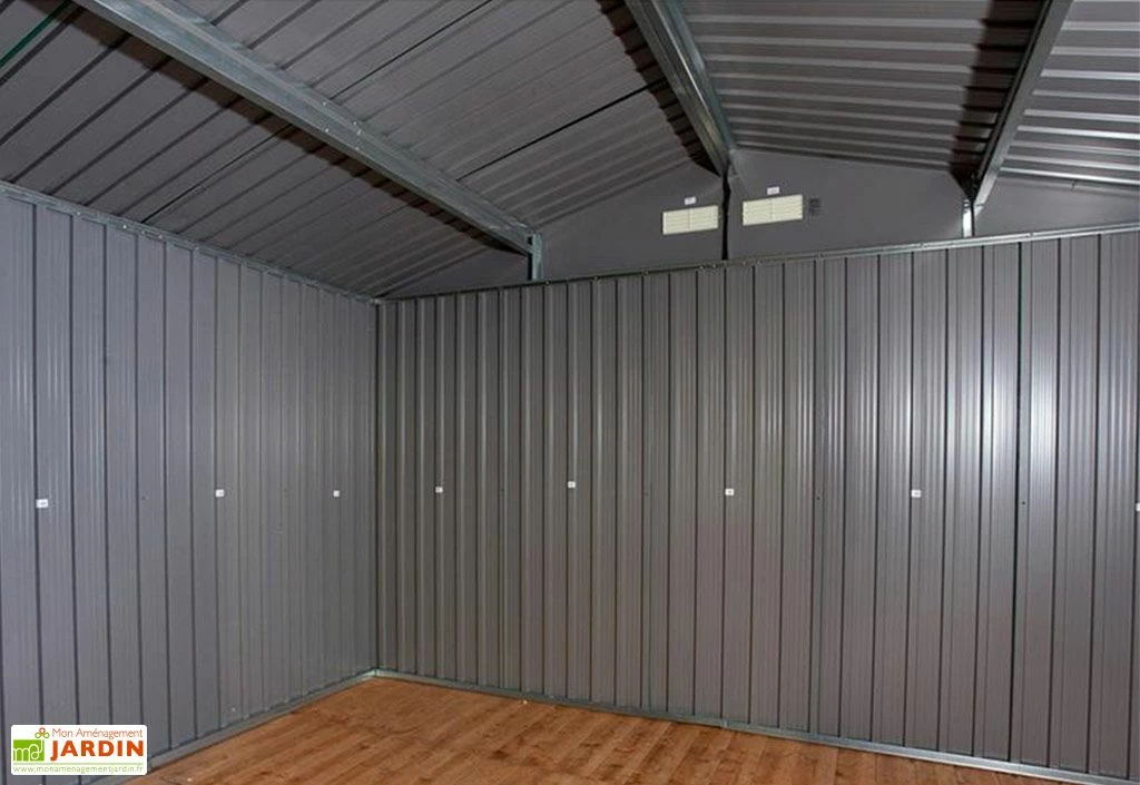 L’abri de jardin en métal comprend une double porte coulissante de 130 x 159,8 cm (l,h). Cette porte est verrouillable pour protéger vos équipements. Les dimensions intérieures de l’abri sont de 2,82 x 3,08 m, offrant une surface utile de 8,7 m².