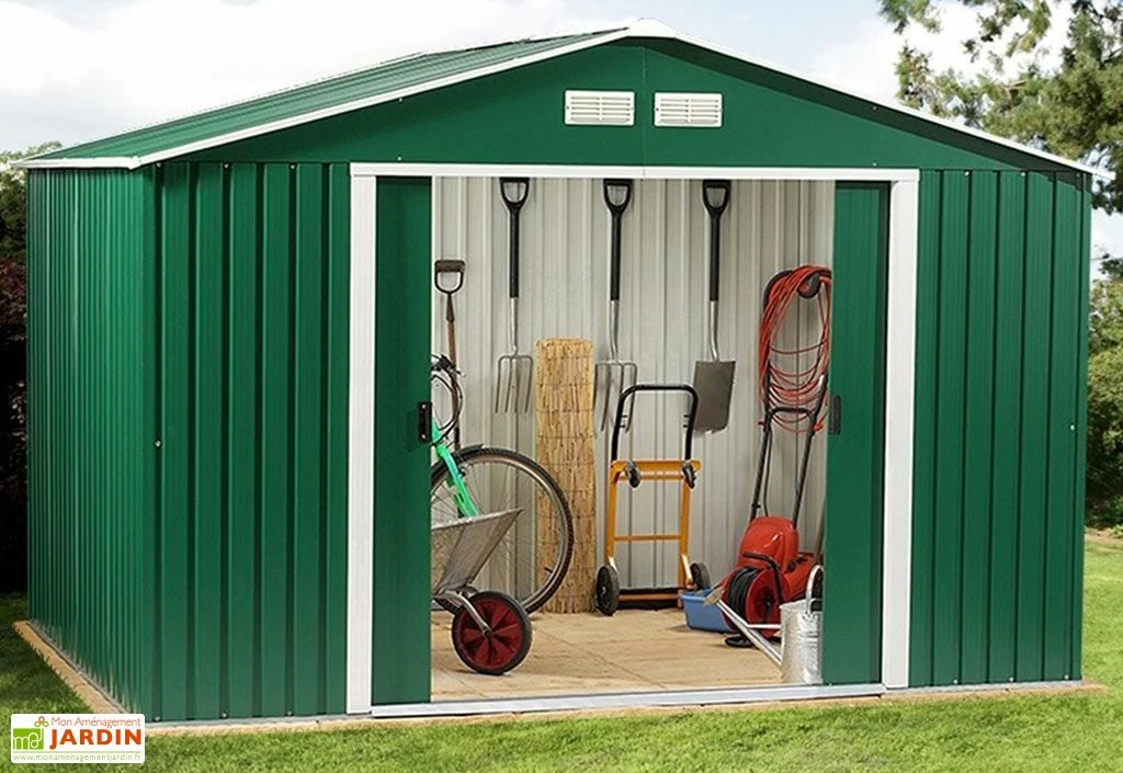 L’abri de jardin Duramax vert pin mesure 3,02 m de longueur, 3,22 m de largeur et 1,96 m de hauteur. Sa grande hauteur vous permet de vous déplacer facilement debout lorsque vous êtes à l’intérieur. Il est équipé d’une grande double porte qui en facilite l’accès, même avec un équipement encombrant. Il vous permet ainsi de stocker vos salons de jardin, matériel de piscine ou votre tondeuse, et même vos vélos.