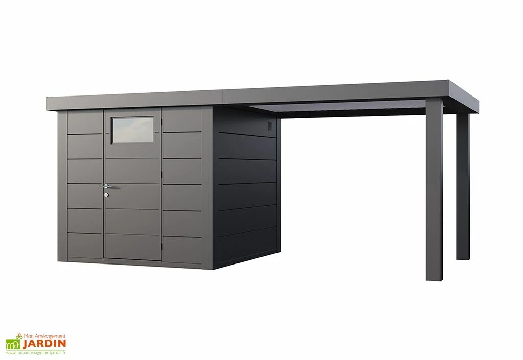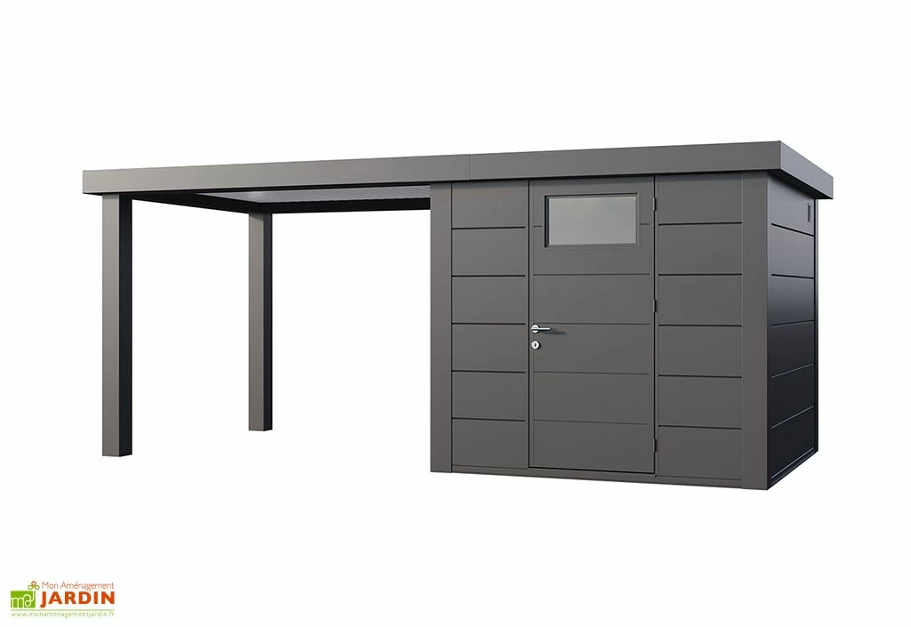 Cette cabane de jardin est dotée de parois de 0,9 mm d’épaisseur qui soutiennent une toiture plate (inclinaison du toit : 2°) composée de panneaux sandwich isolés de 4 cm d’épaisseur. Le toit intègre une gouttière avec descente, pour une évacuation efficace de l’eau de pluie pendant une averse, et pourra supporter une charge de neige de 220 kg/m². L’auvent pourra par ailleurs être monté sur le côté gauche ou à droite de l’abri.