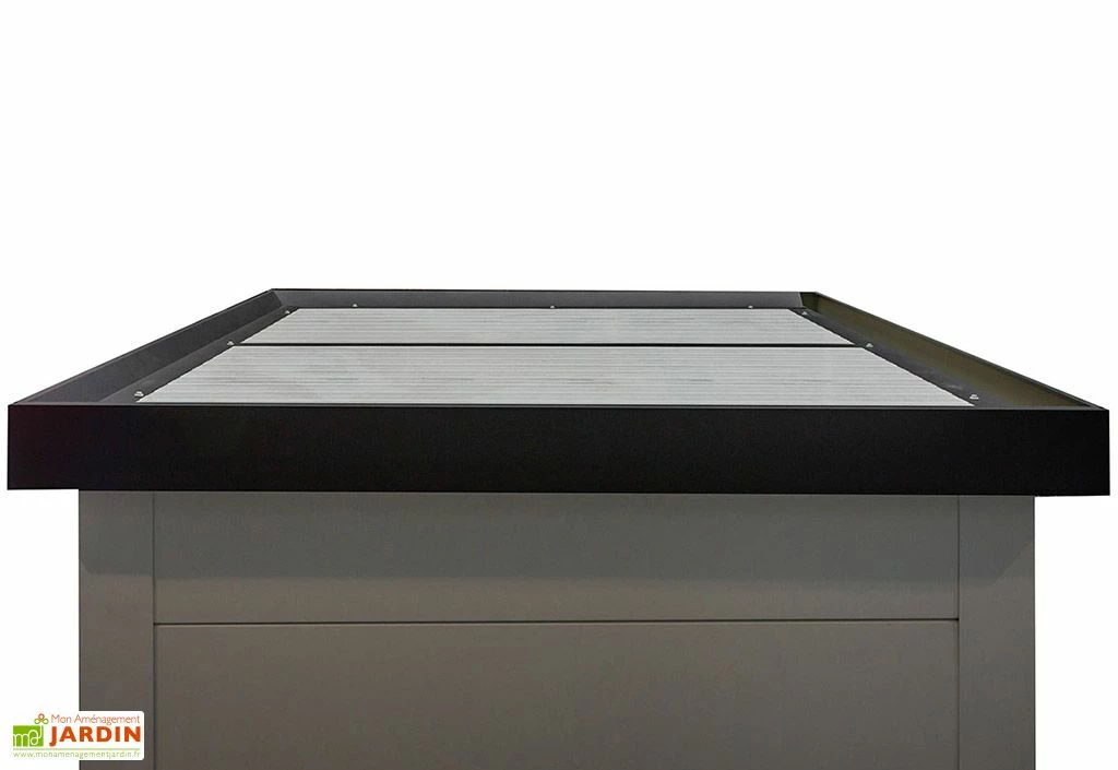 Cette cabane de jardin s’est vue dotée d’une toiture plate (inclinaison du toit : 2°) en panneaux sandwich isolés de 4 cm d’épaisseur. Cette couverture pourra supporter une charge de neige de 220 kg/m² et intègre une gouttière avec descente pour faciliter l’évacuation des eaux pluviales. L’accès à l’intérieur de l’abri se fera grâce à une porte vitrée (verre opalin plexi de 4 mm d’épaisseur) de 87 x 198 cm. Cette porte dispose d’une serrure à barillet et pourra donc être verrouillée afin de sécuriser le contenu de la remise.