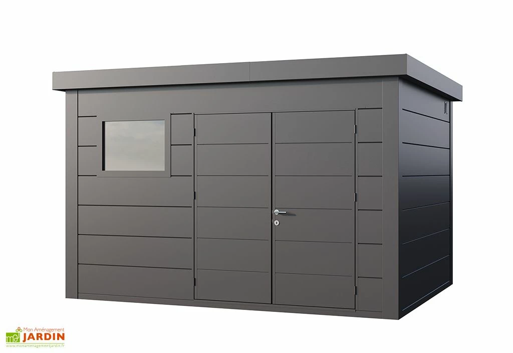 Les parois de cette remise de jardin intègrent des aérations pensées pour éviter le développement de moisissures à l’intérieur et supportent une toiture plate (inclinaison du toit : 2°) composée de panneaux sandwich isolés de 4 cm d’épaisseur. Cette dernière est pourvue d’une gouttière avec descente, pour une évacuation efficace des eaux pluviales pendant une averse. Un plancher en métal est par ailleurs proposé dans l’onglet « Accessoires » si vous souhaitez mieux isoler l’abri de l’humidité émanant du sol ou de la boue.