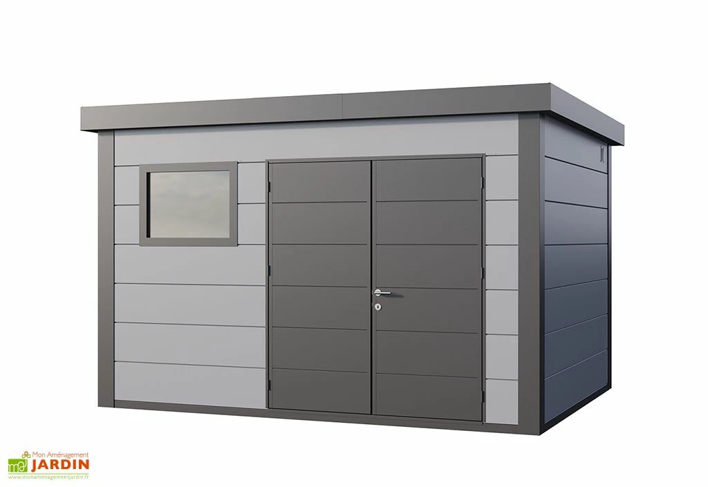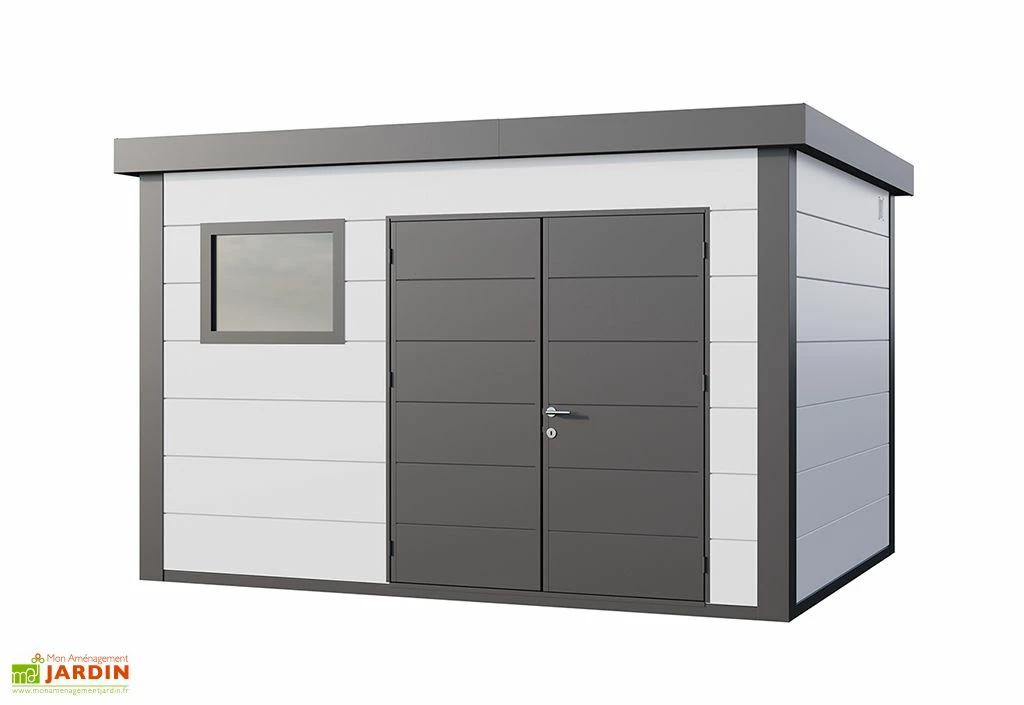 L’abri de jardin Eleganto 3990 Plus de la marque Telluria offre un espace intérieur de 9,7 m² et dispose d’une double porte de 177 x 198 cm, vous permettant ainsi de stocker facilement des équipements d’extérieur relativement encombrants comme du matériel de jardinage ou du mobilier de jardin une fois l’hiver venu. Cette porte est de plus équipée d’une serrure à barillet grâce à laquelle vous pourrez sécuriser le contenu de la remise.