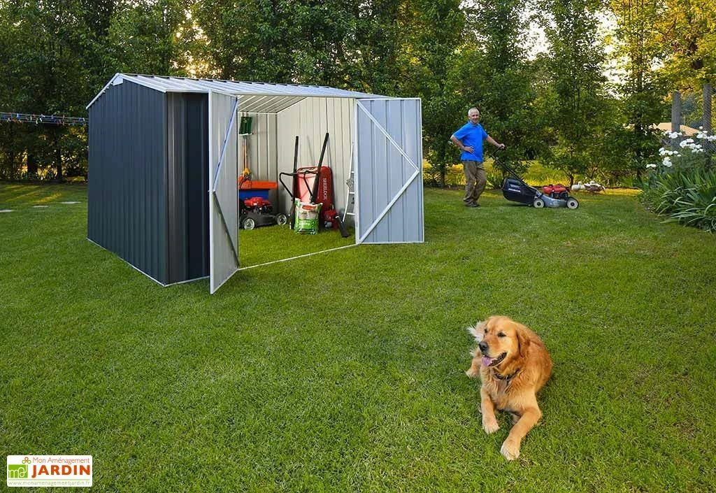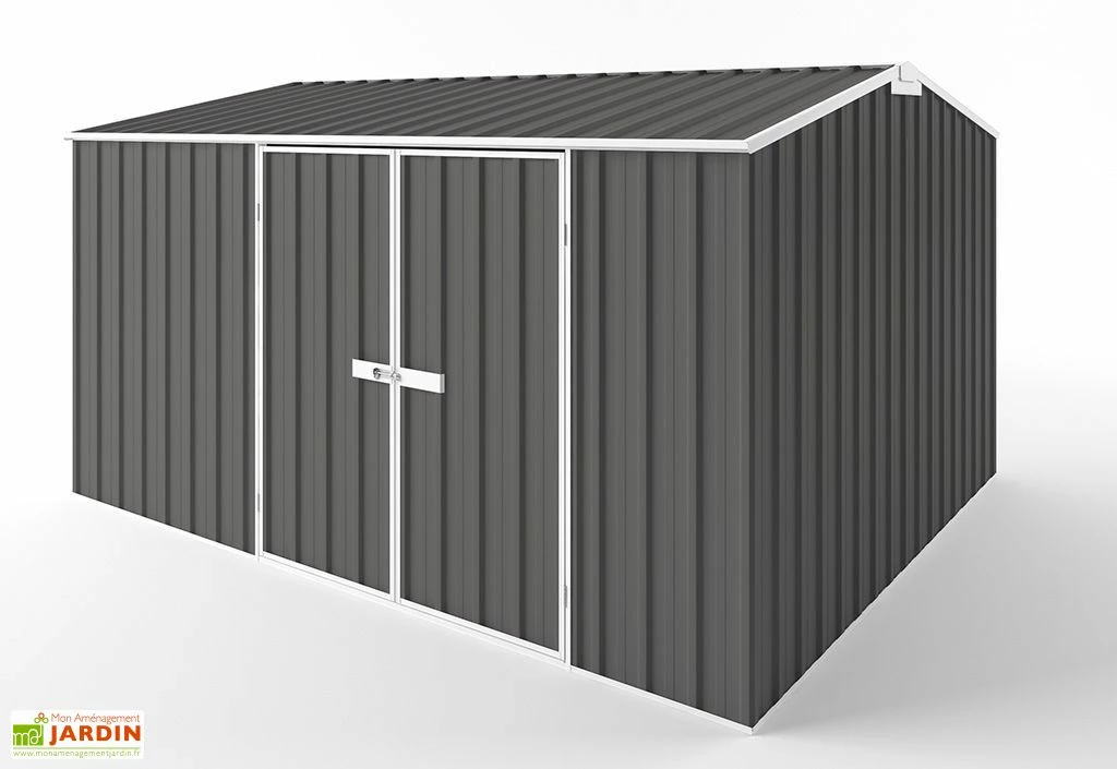 L’abri de jardin en métal, fabriqué en Australie, mesure 3 m de profondeur, 3,75 m de largeur et 2,10 m de hauteur soit une surface hors tout de 11,25 m². Il est en acier et possède une épaisseur de 0,35 mm qui offre une grande solidité à l’abri. Il est équipé d’une grande double porte battante de 1,50 m de largeur et 1,80 m de hauteur.