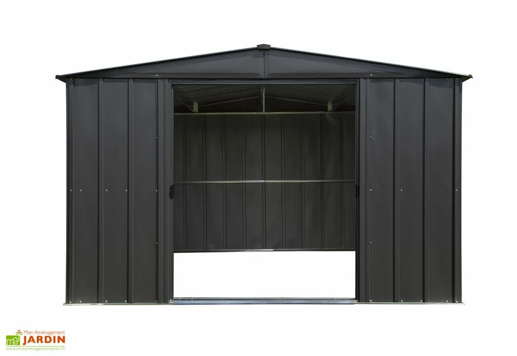 L’abri de jardin dispose d’un design actuel, qui s’intègre facilement dans n’importe quel jardin, d’abord grâce à sa couleur gris foncé (RAL 7021) mais aussi grâce à ses parois qui ne sont pas lisses. Les panneaux sont légèrement martelés apportant ainsi un léger relief, élégant.