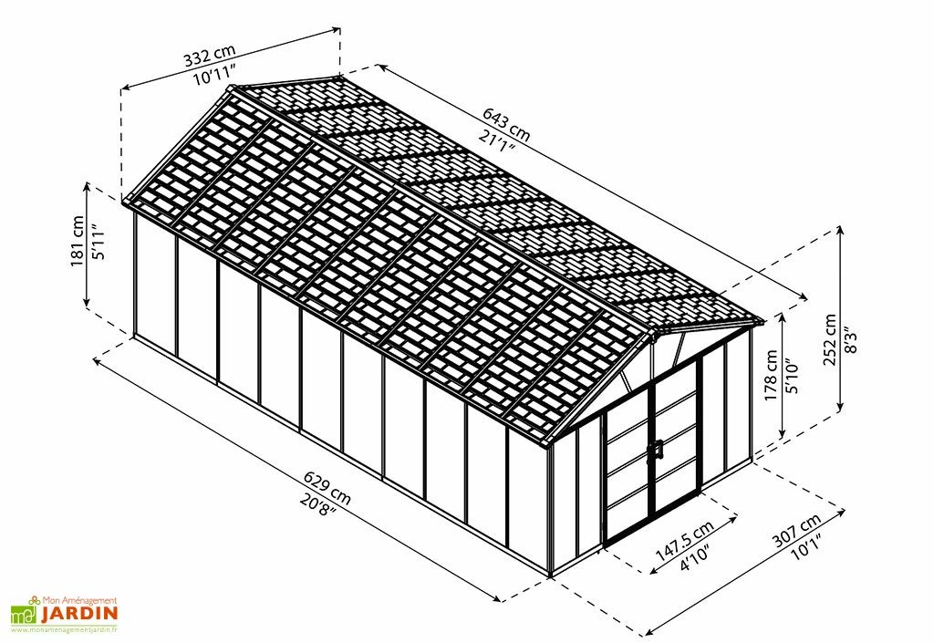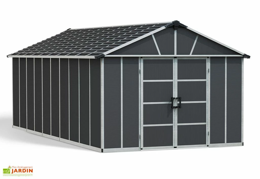 Le grand abri de jardin Yukon de la marque Palram-Canopia est constitué d’une structure en aluminium et de parois en polycarbonate. Il dispose des dimensions suivantes :
