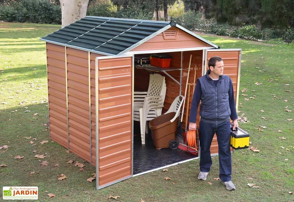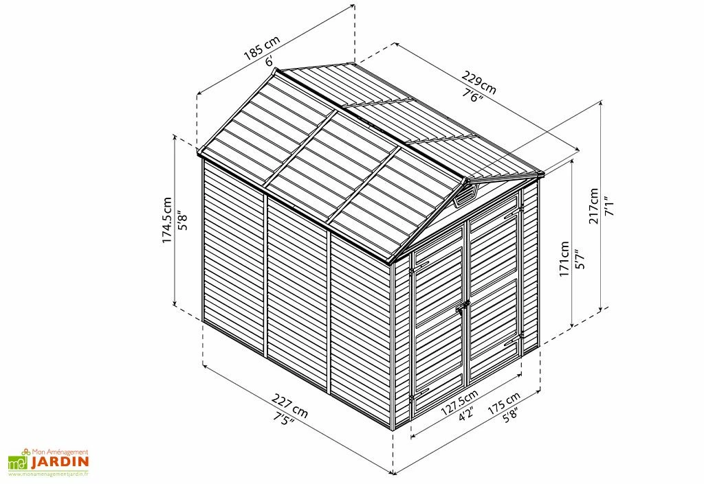 Pour éviter la condensation à l’intérieur de l’abri de jardin, une bouche d’aération est située en haut de la façade avant. Ses dimensions intérieures sont de 2,23 x 1,71 x 2,08 m (l,l,h) pour une capacité de stockage de 7,5 m3. Les dimensions extérieures sont de 2,29 x 1,85 x 2,17 m (l,l,h).