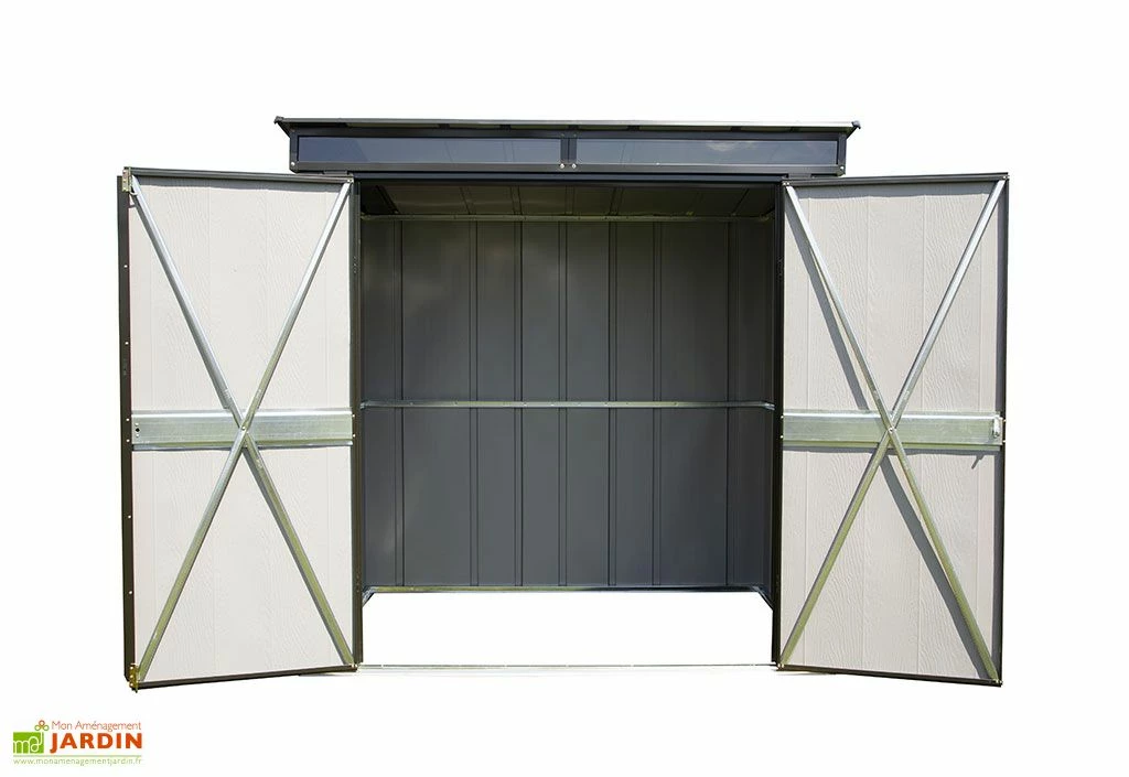 Cette armoire extérieure est dotée d’une toiture légèrement inclinée permettant un écoulement efficace des eaux pluviales. Cette toiture pourra par ailleurs supporter une charge maximale de 100 kg/m², en cas de chutes de neige par exemple. Une fenêtre, située juste en dessous du toit, permettra de profiter d’un peu de luminosité intérieure tandis qu’une double porte de 151 x 175 cm facilitera le rangement d’équipements relativement encombrants. Cette porte pourra d’ailleurs être verrouillée afin de protéger le contenu de l’armoire.