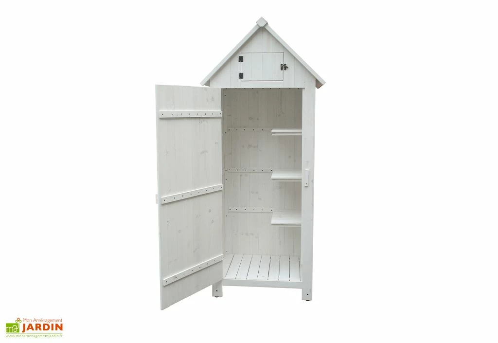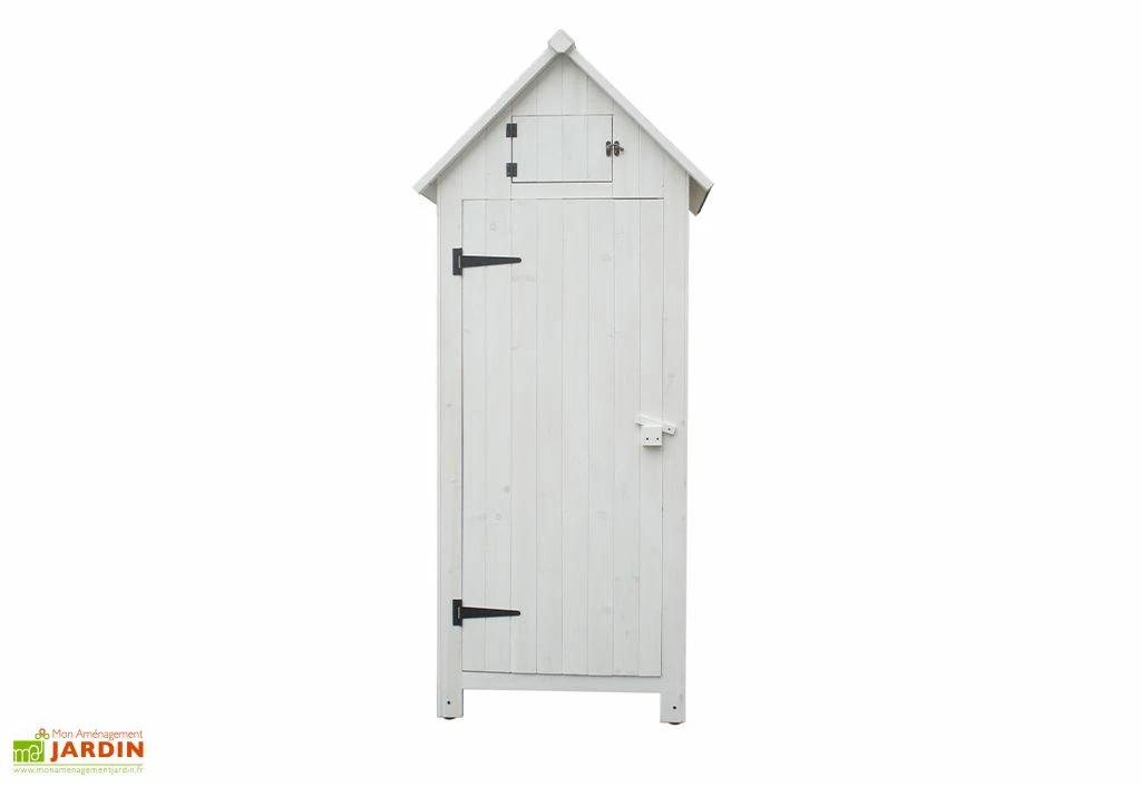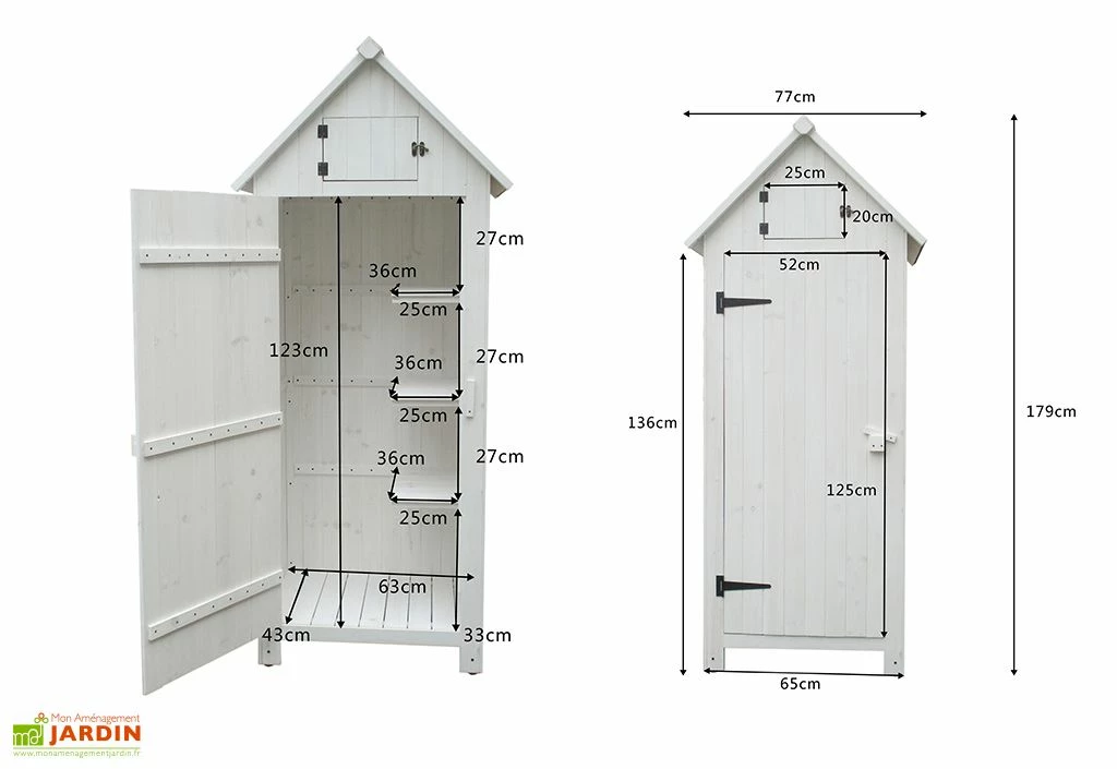 Côté finitions, l’armoire de jardin s’est vue dotée d’une toiture couverte de toile bitumée et la peinture blanche utilisée pour protéger le bois est résistante à l’eau. Un loquet en bois vient compléter la porte de 52 x 125 cm (épaisseur 3 mm).