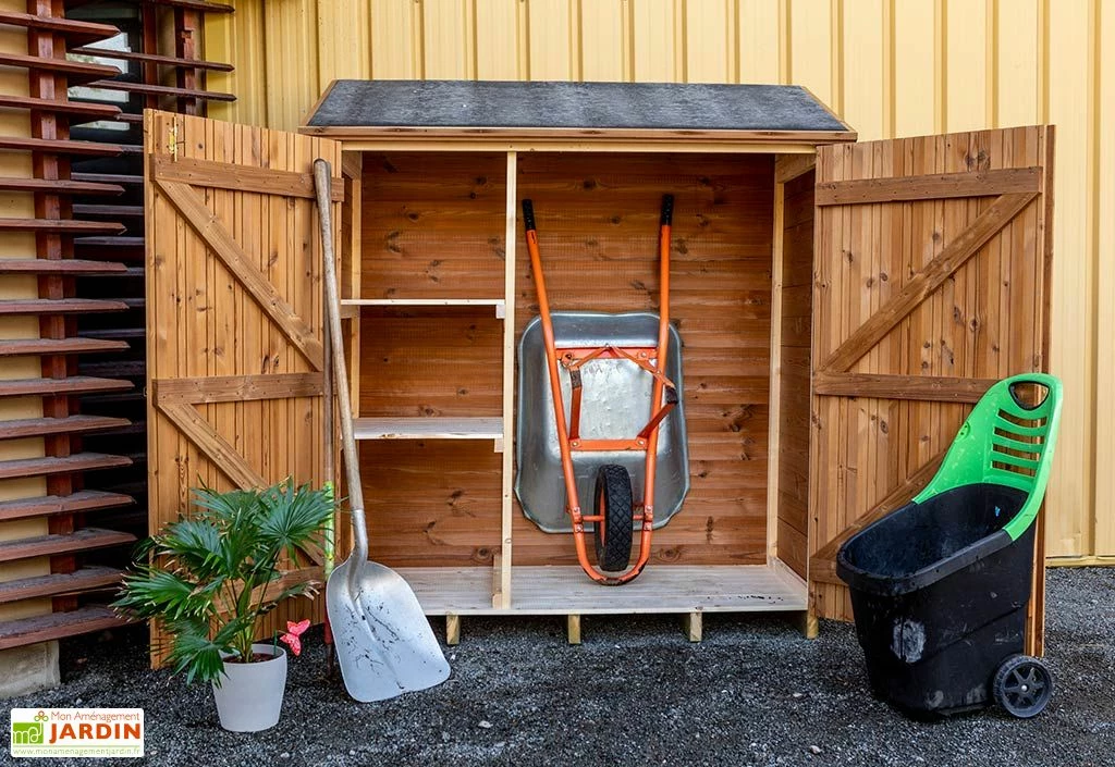 Idéale pour ranger des outils et du matériel peu encombrant, cette armoire de jardin offre un espace intérieur de 1,05 m² et intègre deux étagères. Ses parois de 19 mm d’épaisseur supportent une toiture en pente recouverte de feutre bitumeux et accueillent une double porte de 2x 76 cm de large sur 150 cm de haut. Un plancher en bois brut permettra d’assurer une bonne isolation au niveau du sol.