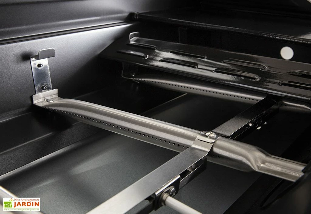 Le barbecue est compatible avec du gaz butane ou propane et possède un raccordement au gaz simple et sécurisé. Il possède une puissance de 11,5 kW. Ses trois brûleurs s’allument indépendamment par Piezo.
