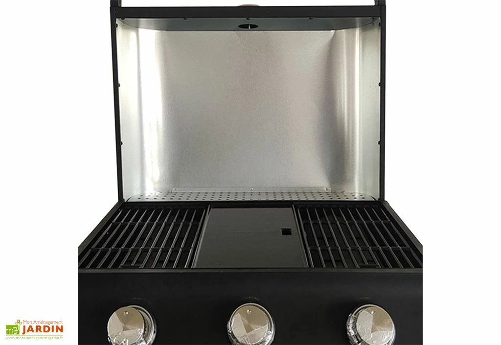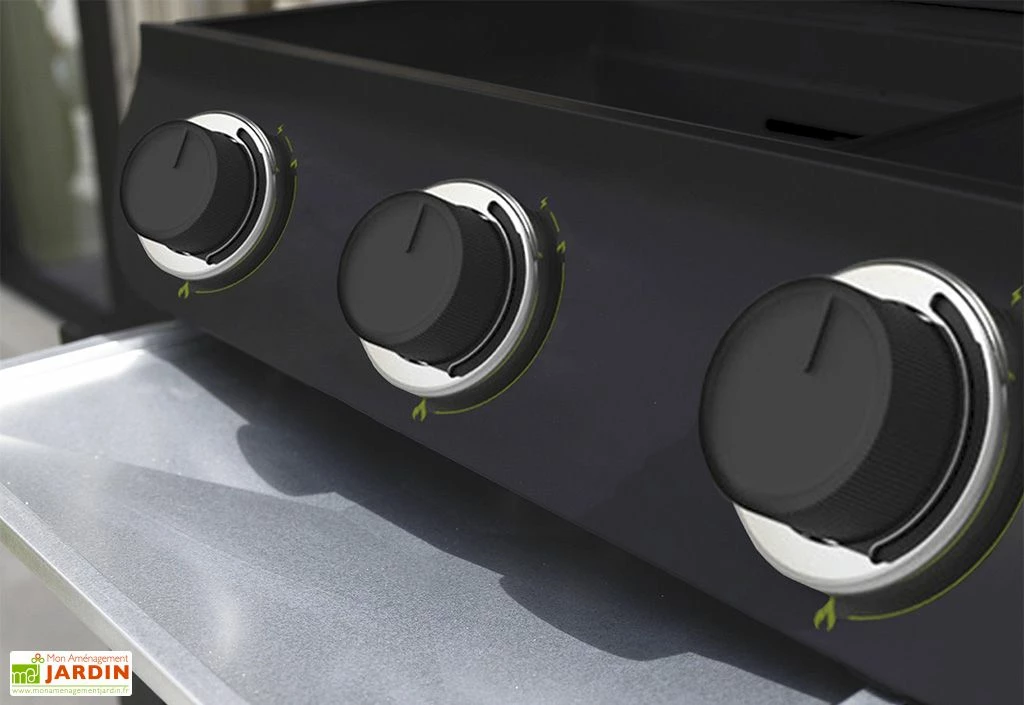 La surface de cuisson du barbecue mesure 60 x 40 cm vous permettant de cuisiner pour plusieurs personnes. Elle est équipée de deux grilles et d’une plancha pour permettre une cuisson variée des aliments. Les grilles et la plancha sont fabriquées en fonte émaillée, un matériau très résistant à la chaleur et facile à nettoyer. Le barbecue dispose de trois brûleurs droits en acier inoxydable, ce qui garantit une cuisson rapide et uniforme.