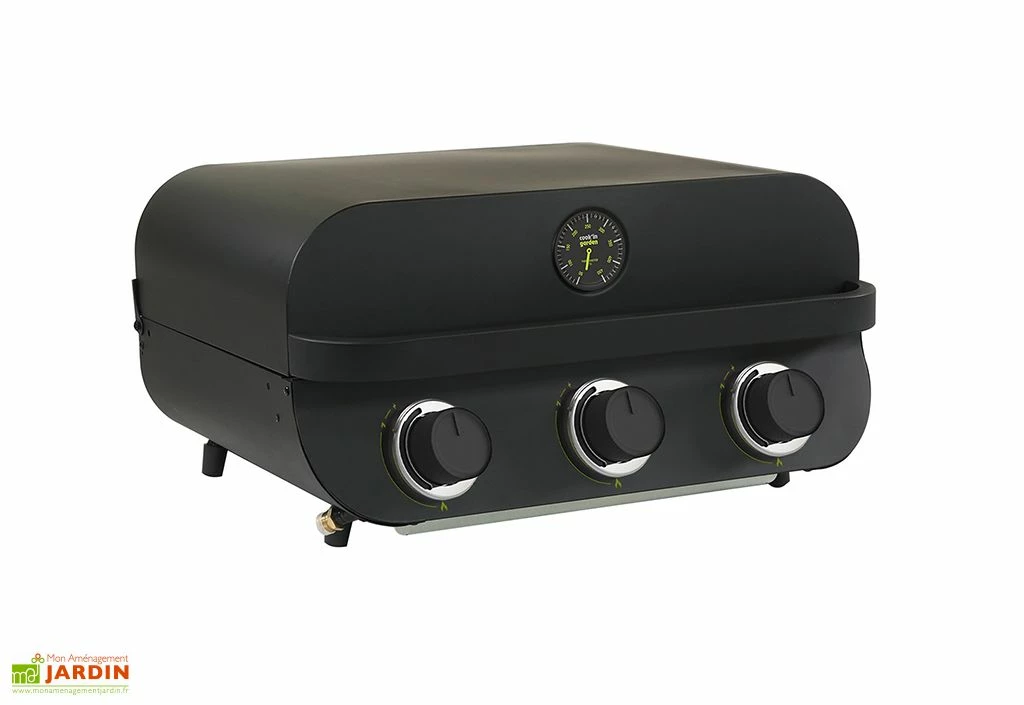 Ce barbecue au gaz de la marque Cook’in Garden est un équipement de cuisine extérieure pratique qui vous permettra de cuire de nombreux aliments grâce à ses deux grilles et sa plancha fournies. Avec ses dimensions de 64 cm de longueur sur 55 cm de largeur pour 40 cm de hauteur, il est compact et facilement transportable. Il est conseillé de poser le barbecue sur une desserte ou un meuble de cuisine extérieure.