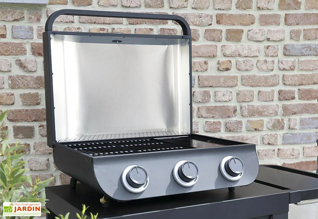 Le barbecue au gaz à poser est équipé d’un récupérateur de graisse pour éviter que les graisses ne tombent sur les brûleurs et ne créent des flammes dangereuses. Il est aussi équipé d’un capot doté d’une poignée qui permet de conserver la chaleur et de cuisiner les aliments à l’étouffée. Le couvercle en métal assure également la protection des grilles ainsi que de la plancha lorsque le barbecue au gaz n’est pas utilisé.
