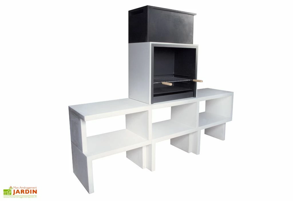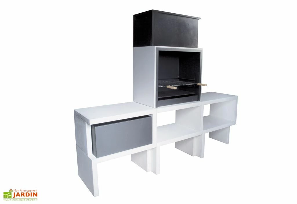 Ce barbecue fixe Blive est constitué de différents modules en béton fibré de 5 à 6 cm d’épaisseur, selon les éléments, à assembler vous-même. Le béton utilisé étant parfaitement hydrofuge, il ne craindra ni l’humidité, ni le gel et le barbecue résistera aux intempéries ainsi qu’à l’usure, le tout sans exiger d’entretien particulier. Les divers modules qui le composent offrent de plus des espaces de rangement pour votre bois ou charbon de bois, et pourront même être complétés par les tiroirs métalliques disponibles en option.