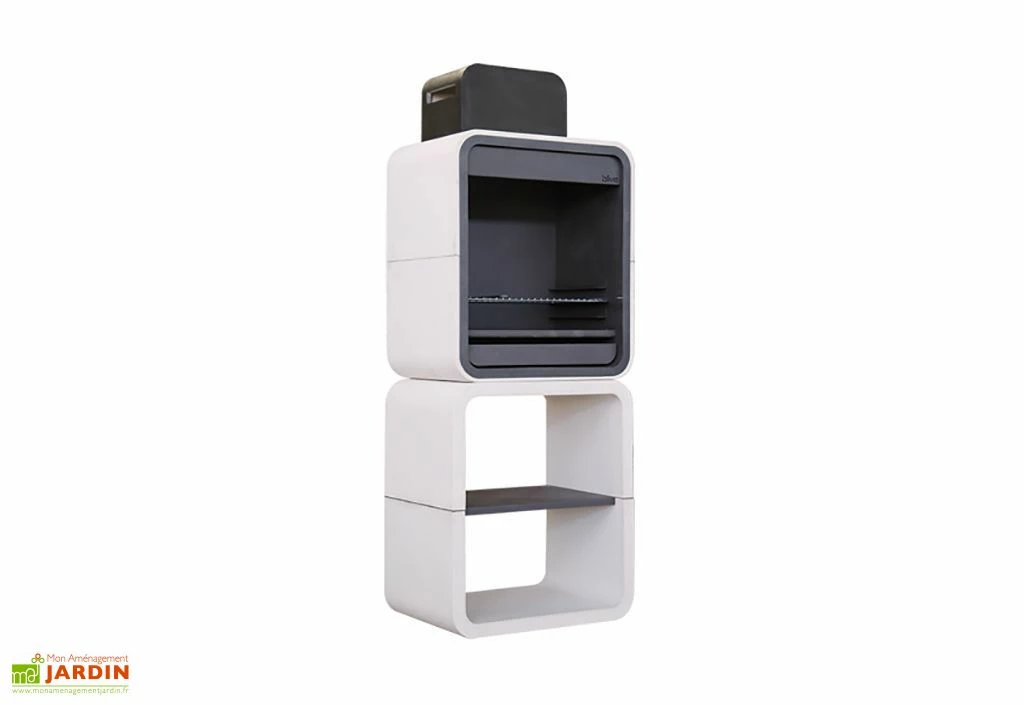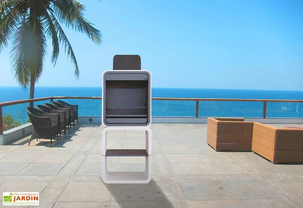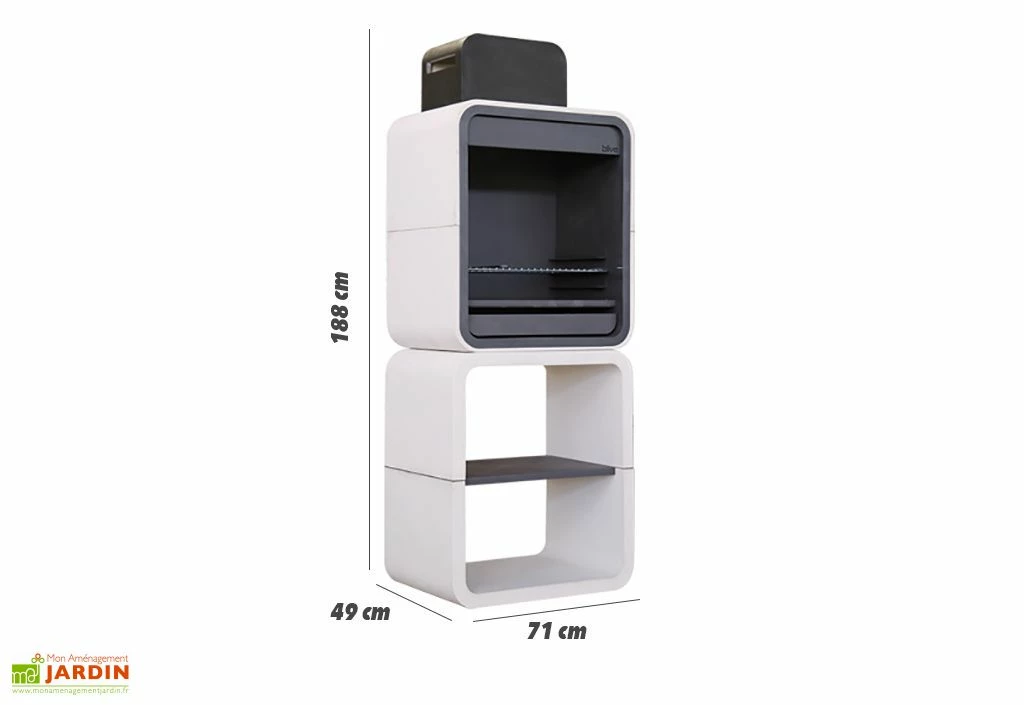 Ce barbecue design Blive est composé d’une structure en béton et d’une cheminée métallique. Il associe un look moderne à une construction extrêmement robuste, le béton utilisé étant fibré et hydrofuge, donc insensible à l’humidité et au gel. Le foyer est lui aussi conçu en métal traité anti-corrosion et est recouvert d’une peinture thermorésistante. Le tout se montrera donc très résistant sans pour autant nécessiter d’entretien particulier.