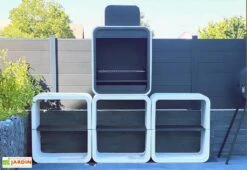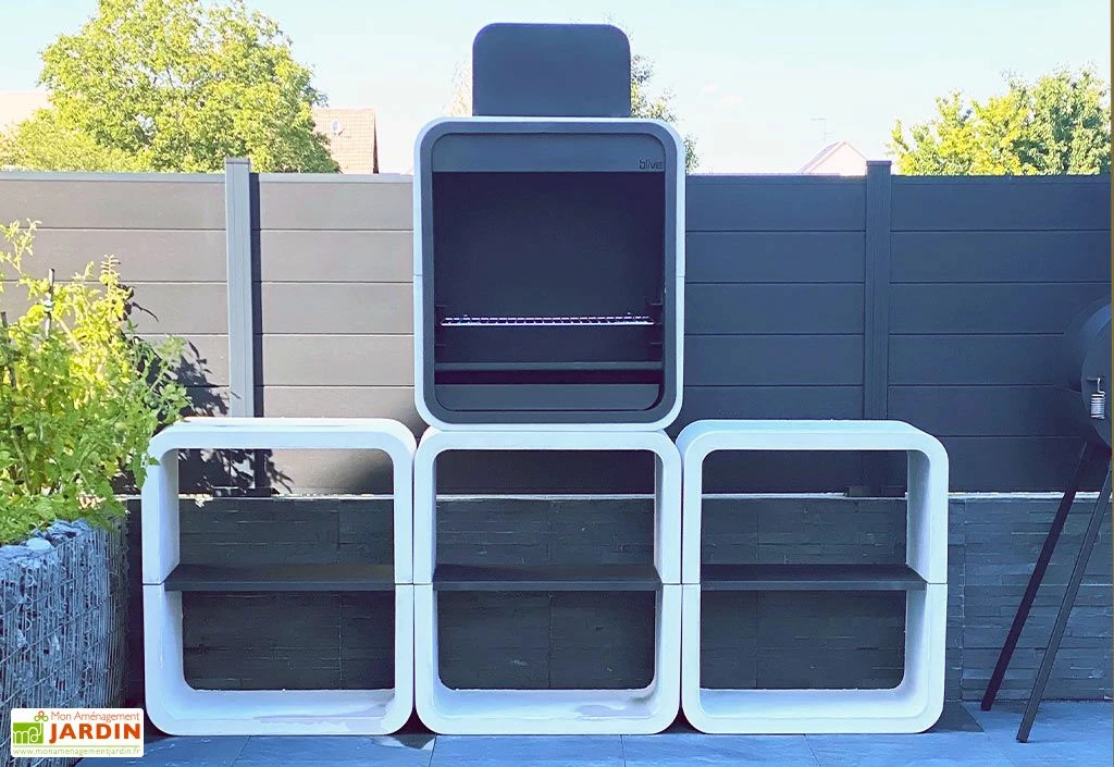 Ce barbecue design de chez Blive profite d’un look à la fois moderne et original qui lui permettra de ne pas passer inaperçu dans votre jardin ! Il est composé de différents modules à assembler soi-même, ces derniers étant fabriqués en béton fibré hydrofuge, un matériau insensible à l’humidité et autres agressions extérieures, et ce sans exiger d’entretien particulier. La zone de cuisson est pour sa part revêtue de métal traité anti-corrosion et recouvert de peinture thermorésistante, le tout complété par une cheminée permettant de faciliter l’évacuation des fumées.