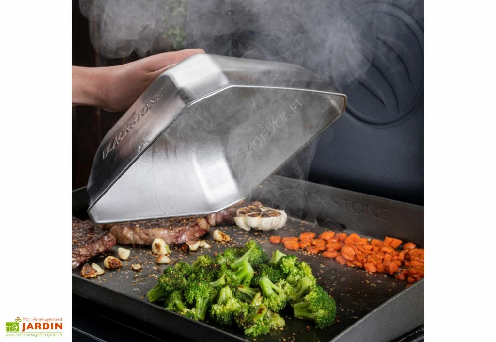 Cette cloche de cuisson Blackstone est parfaite pour fumer viandes, poissons et légumes, pour faire fondre du fromage sur vos steaks ou tout simplement pour réduire le temps de cuisson. Elle est conçue pour être utilisée en complément d’une plancha et est fabriquée en acier inoxydable, ce qui lui assure une grande robustesse et de belles propriétés en termes de conservation de la chaleur. Sa poignée vous permettra de la manipuler sans vous brûler et la cloche pourra être lavée au lave-vaisselle.
