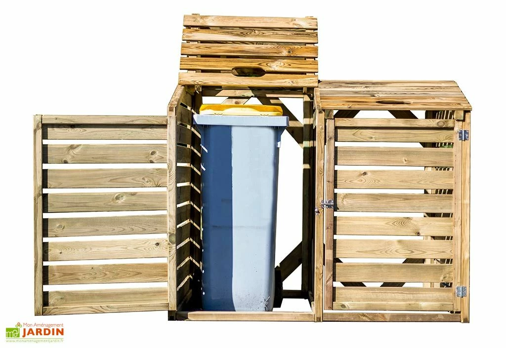 Le cache-poubelle double en bois de chez Habrita est une solution esthétique pour ranger vos poubelles disgracieuses. En pin traité autoclave classe 3, votre cache poubelle s’adosse à un mur. L’arrière du cache poubelles est ouvert, il est équipé de croisillons. Le couvercle à rabat permet une utilisation plus facile. Ses dimensions sont de 1,50 x 0,90 x 1,20 m (l,l,h). Les lames de côté possèdent une épaisseur de 8 mm et les lames du couvercle possèdent une épaisseur de 14 mm. Il est garanti 5 ans.