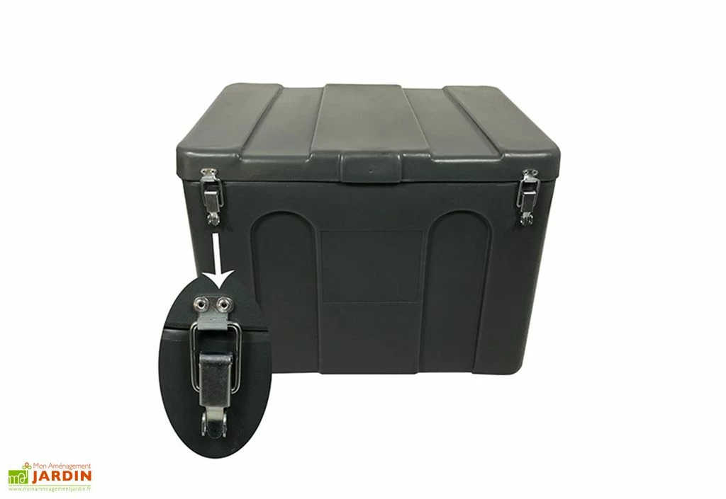 Ce coffre de jardin de chez Plast ’Up est équipé de deux charnières et de deux grenouillères cadenassables afin de sécuriser son contenu. Il peut accueillir aussi bien des produits chimiques qu’écologiques.