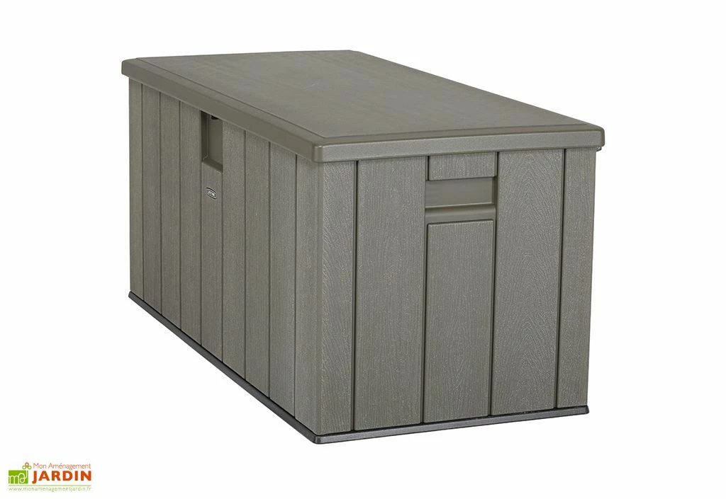 Le coffre est en polyéthylène haute densité, un matériau résine parfaitement résistant aux agressions extérieures. Il ne craint pas la moisissure, il est insensible à la corrosion et aux attaques d’insectes. Pour une intégration parfaitement dans le jardin, le PVC imite parfaitement le bois. Vous profitez ainsi d’un coffre avec les avantages esthétiques du bois sans les inconvénients de l’entretien.