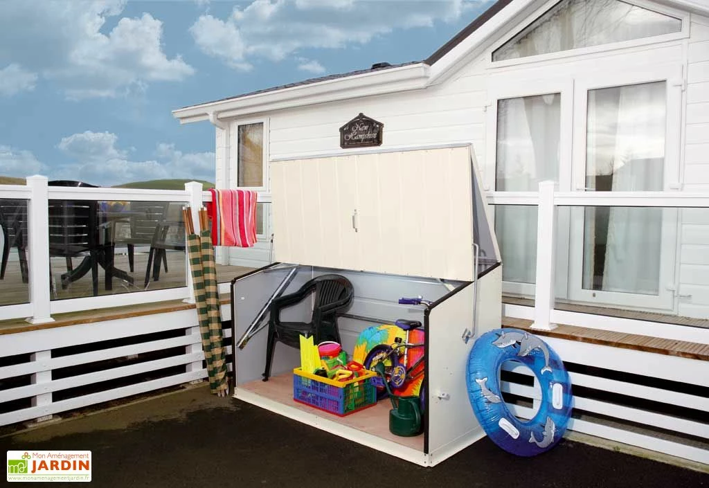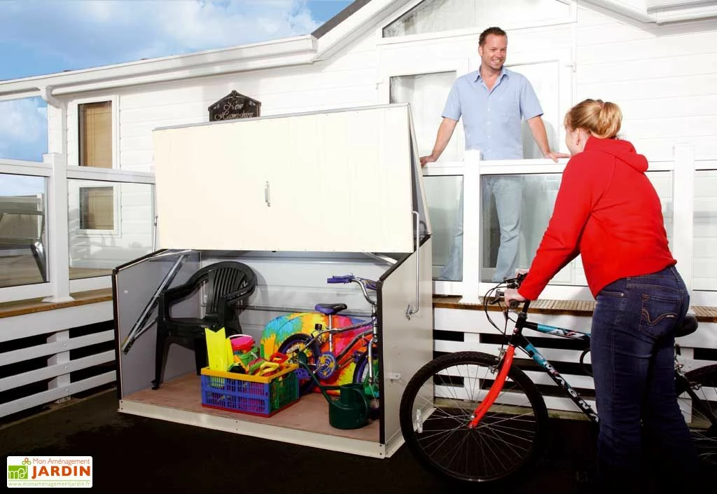 L’ouverture du coffre se fait sans effort. Même sans entretien, l’abri gardera un aspect neuf. Il résiste au feu et à la corrosion, même dans les régions près des côtes. Le matériel permettant de fixer le coffre est fourni avec l’abri.