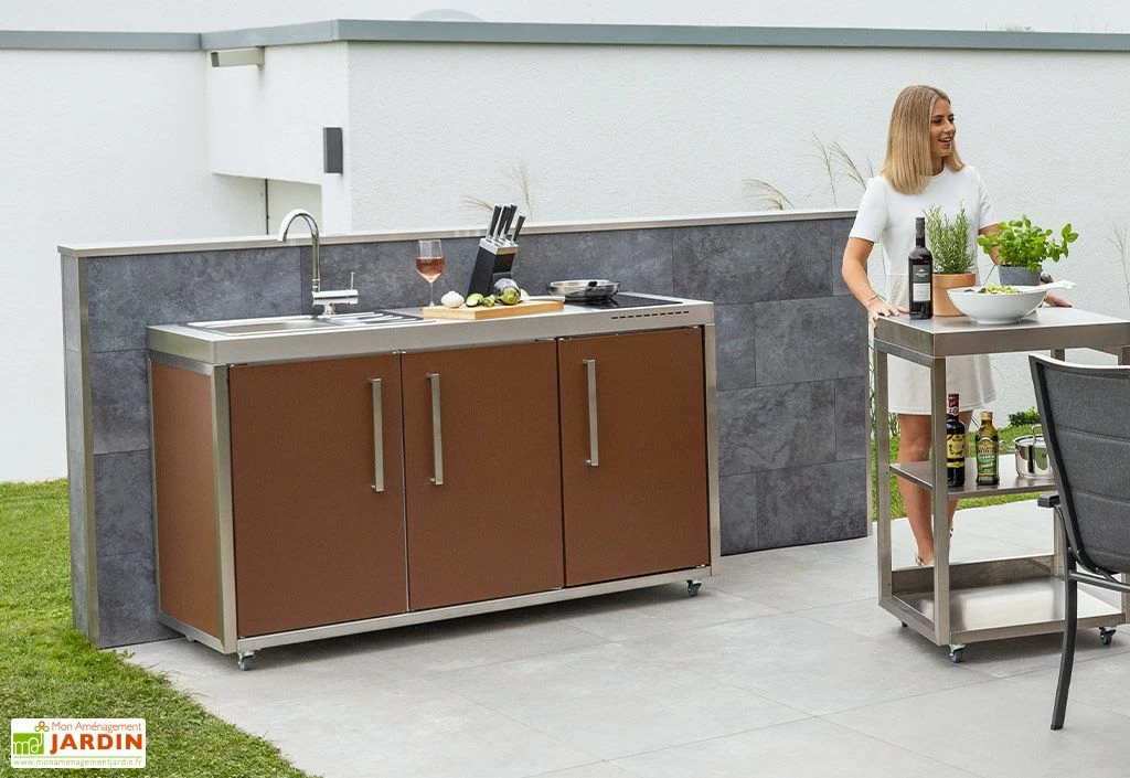 Son plan de travail comprend la plaque à induction et l’évier, dont vous pouvez choisir la disposition. Ses façades sont en métal plein, double parois et isolées. Le thermolaquage est disponible dans 5 coloris : rouge bordeaux, sablé, vert pomme, gris ardoise et brun lave.