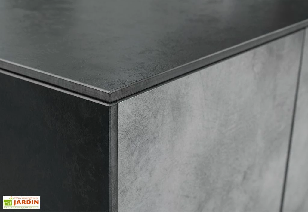 Cette cuisine d’été est dotée de 2 plans de travail : un premier grand plan de travail de 181 x 61,5 cm (L,p) et de 10 mm d’épaisseur incluant un évier ; un deuxième plan de travail de 101 x 61,5 cm (l,p), sur la gauche. Il vous permettra de poser votre plancha par exemple (non incluse).