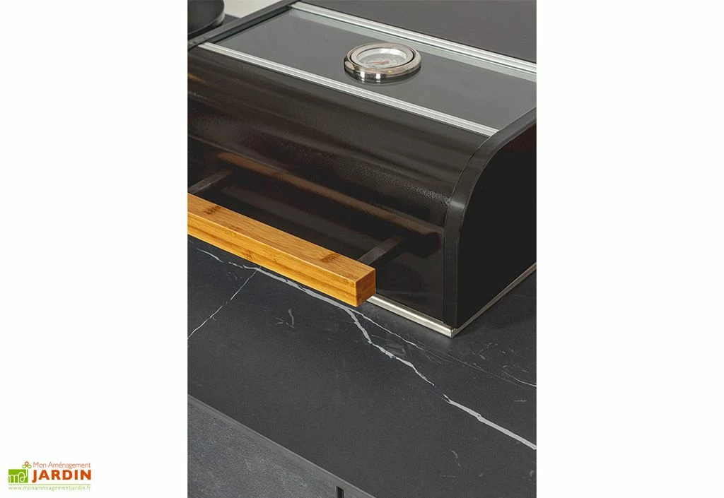 Cette cuisine d’été est dotée d’une table de cuisson à gaz de la marque Planet Palnic comportant 1 feu, elle est idéale pour les cuissons rapides à la poêle. Vous profiterez également d’un magnifique grill noir OneQ avec beaucoup de cachet. Il fonctionne à gaz et s’ouvre et se ferme à l’aide de sa jolie poignée en bois. Vous pourrez donc réaliser vos grillades, faire cuire vos brochettes de légumes, ou faire fumer votre viande ou votre poisson tout en suivant la température intérieure grâce au thermomètre intégré.