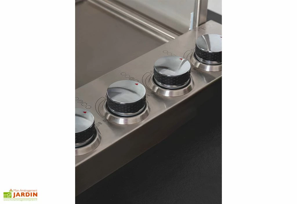 Cette cuisine est composée de matériaux de haute qualité. Son acier inoxydable laqué noir est très solide et résistant face à la corrosion. Vous pourrez profiter de sa grille de cuisson performante GAZGRILL 850 de la marque INDU+, idéale pour cuire vos légumes, ainsi que de l’espace grill pour la cuisson de vos viandes. L’espace de cuisson est refermable et ses boutons possèdent une jolie finition assortie à votre plan de travail. Cette cuisine est également dotée d’un évier Cana HV330 avec un bac en inox, un mitigeur et un système d’évacuation standard. Il comporte une robinetterie TEKA FO985 au style très raffiné.