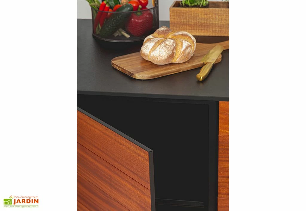 Cette cuisine extérieure possède un très joli tablier résistant fabriqué par frittage ou HPL (Hight Preassure Laminated) dans un coloris Black Rock. Ce plan de travail est donc composé de fines couches de résine de quartz soudées entre elles. Sa structure est fabriquée en acier inoxydable laqué de couleur noire. La façade est composée de bois exotique signé SAPELI, qui lui donne tout son charme authentique. Ce mix de couleurs et de matériaux lui confère un aspect élégant et exotique. Elle s’intégrera parfaitement dans votre espace extérieur surtout s’il présente de la végétation.