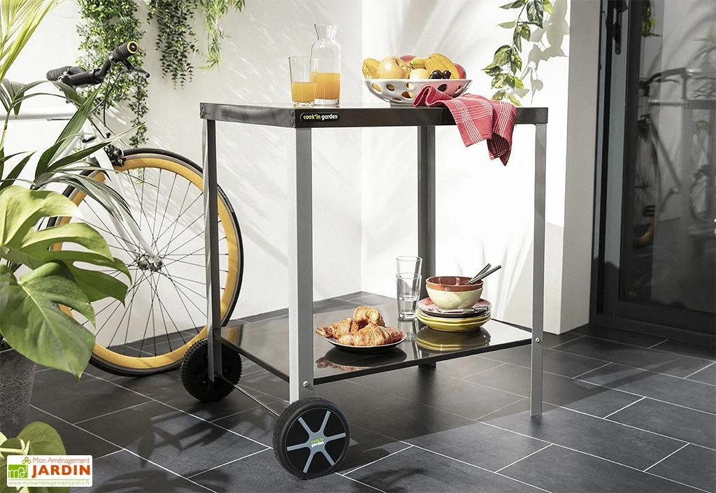 Facilement déplaçable grâce à ses deux roues renforcées, la desserte Media S de chez Cook’in Garden sert de support pour une plancha électrique ou au gaz, mais elle peut aussi servir d’espace de stockage et de préparation.