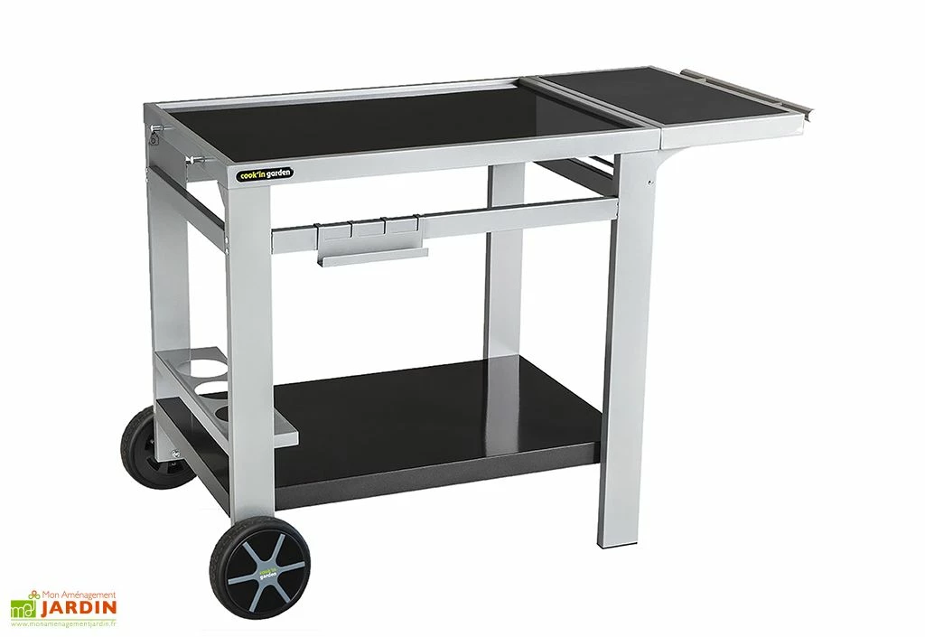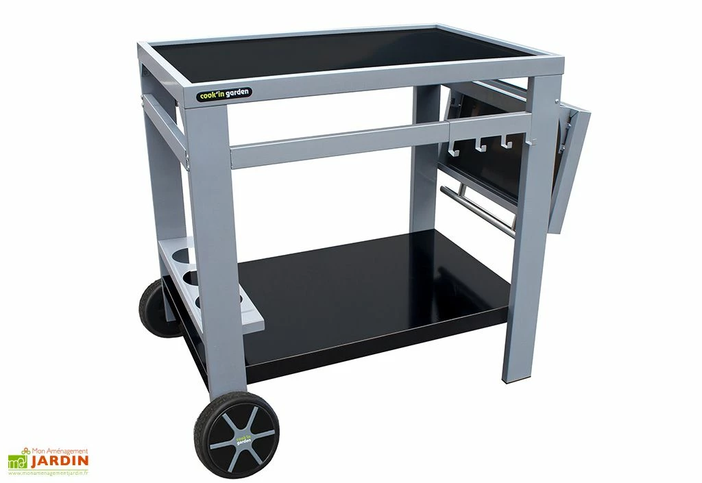 Cette desserte est un accessoire pratique et fonctionnel pour faciliter la préparation des aliments en extérieur, mais elle vous permettra également de poser votre barbecue au gaz ou votre plancha. Le meuble de cuisine extérieure affiche des dimensions de 122 cm de longueur sur 65 cm de largeur pour 80 cm de hauteur et pèse 18,60 kg. La desserte est facile à déplacer grâce à ses 2 roues et à la poignée intégrée.