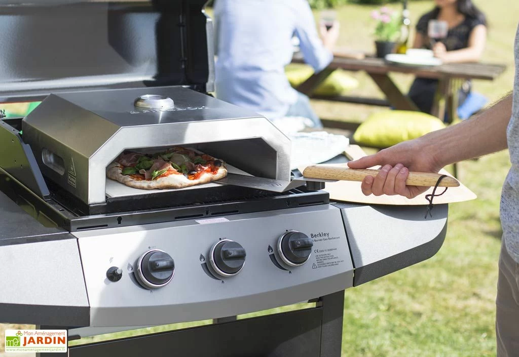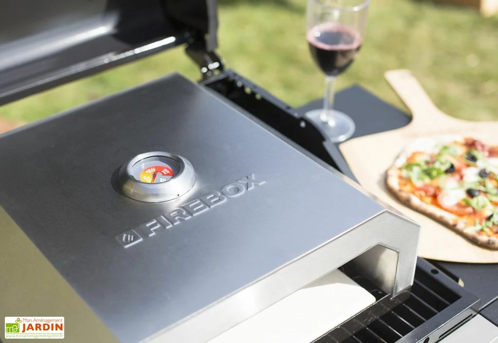 Le four à pizza de chez Buschbeck est en acier inoxydable. Il mesure 15 cm de hauteur, 40 cm de largeur et 35 cm de profondeur. Fabriqué en Allemagne, il dispose d’une pierre de cuisson et inclut un thermomètre. Le four s’installe sur les cheminées Grill, les barbecues et vous permet de cuire vos pizzas rapidement. Le four permet de cuire des pizzas jusqu’à 30 cm de diamètre.