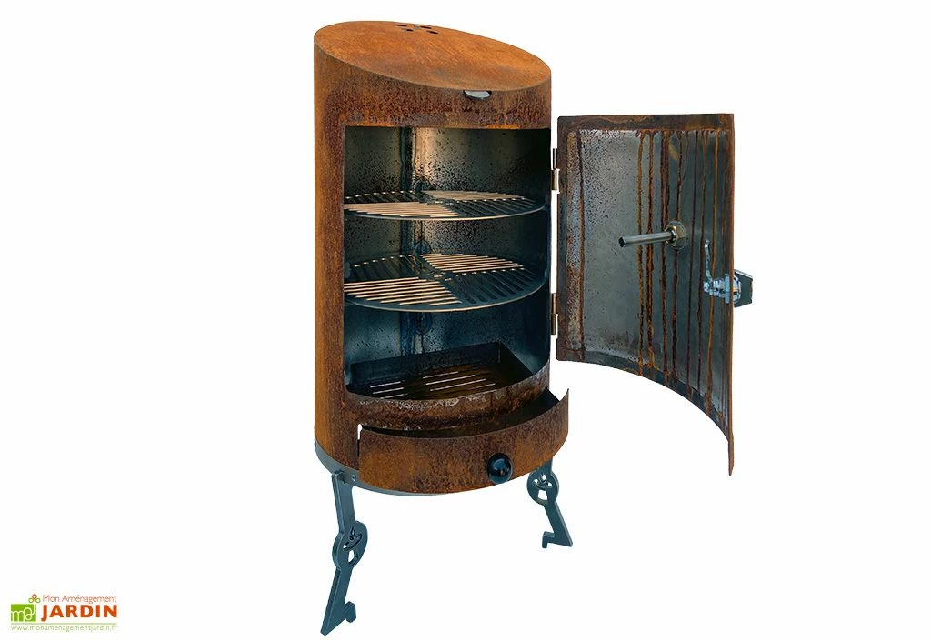 Entièrement conçu en acier oxydé, ce fumoir pour brasero profite d’un design rustique et d’une grande robustesse. Il mesure 30 cm de diamètre pour 60 cm de haut et est équipé d’une large porte permettant d’insérer les aliments à fumer en toute simplicité. Il est également doté d’un tiroir pour la récupération et le vidage des cendres.