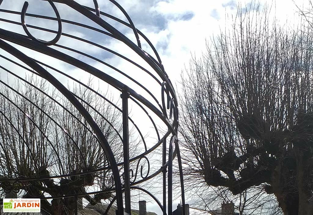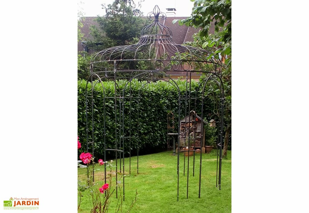 Cette gloriette mesure 2,40 m de diamètre et 3,40 m de hauteur totale avec une belle toiture ouvragée. Elle est constituée de tiges en fer plein carrées de 14 mm et rondes de 10 mm. Les passages aménagés tout autour de la structure mesurent 2,10 m de hauteur et 88 cm de largeur. Ses 300 kg lui offrent une excellente stabilité.