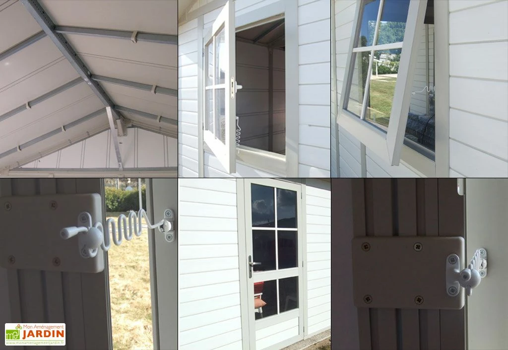 Le toit est en lames PVC menuisées avec une pente à 20°. La double porte vitrée de 1,44 x 1,80 m (l,h) a des vitres de portes 56,2 x 59,5 cm (l,h), une poignée et une serrure à clef. L’abri dispose d’une lucarne de 68,2 x 60,9 cm (l,h).