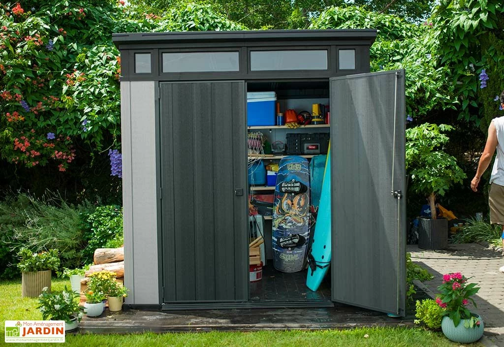 L’abri de jardin est directement issu de la gamme Brossium de chez Keter. Il est en polypropylène extrudé, un matériau qui ne craint pas la moisissure, les insectes ni la rouille. Sa structure est constituée d’une double paroi de 20 mm, traitée contre les UV, avec une armature en acier.