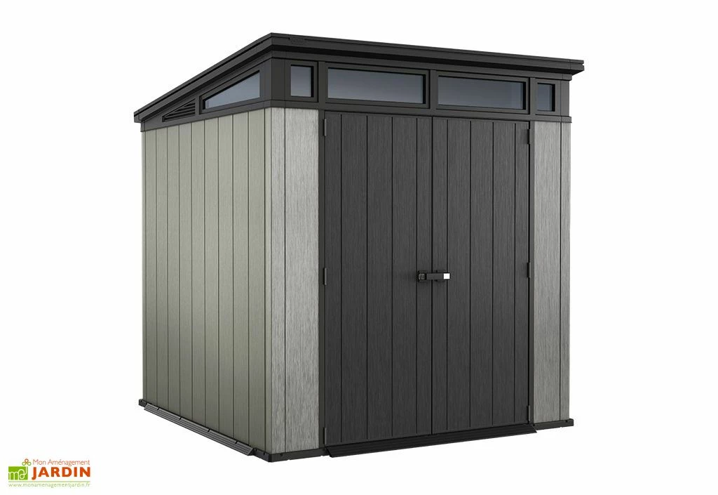 L’abri de jardin carré mesure 2,18 m de longueur et de largeur et 2,26 m de hauteur (dimensions hors tout) pour une surface de 4,75 m². Il dispose d’une toiture une pente vers l’arrière imitant les tuiles en 3 dimensions. La toiture est en polypropylène et peut supporter jusqu’à 125 kg/m² de neige.