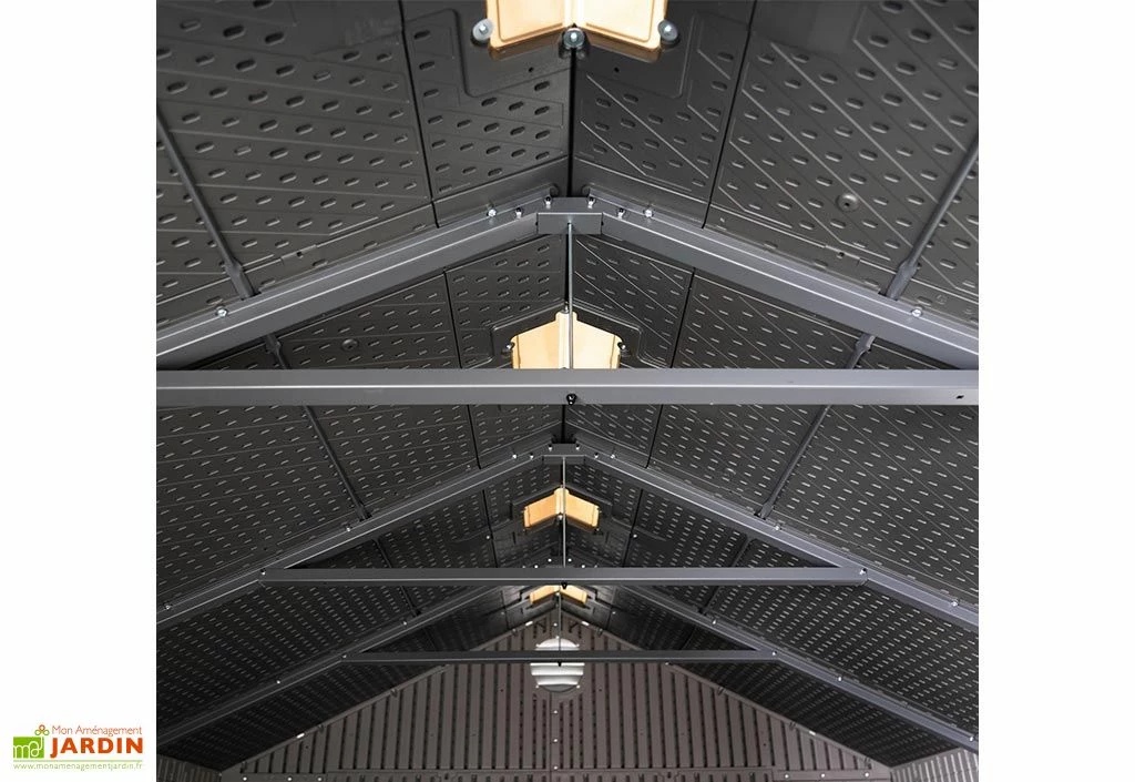 La toiture de cette remise de jardin repose sur une charpente en acier inoxydable et compte deux pans imitation tuiles, pour un écoulement efficace des eaux pluviales. Elle intègre également des puits de lumière afin de vous offrir, en complément de la fenêtre présente sur l’une des parois, un peu de luminosité au sein de l’abri. La double porte présente en façade se chargera pour sa part de faciliter d’accès à l’intérieur de la cabane, même avec du matériel relativement encombrant.