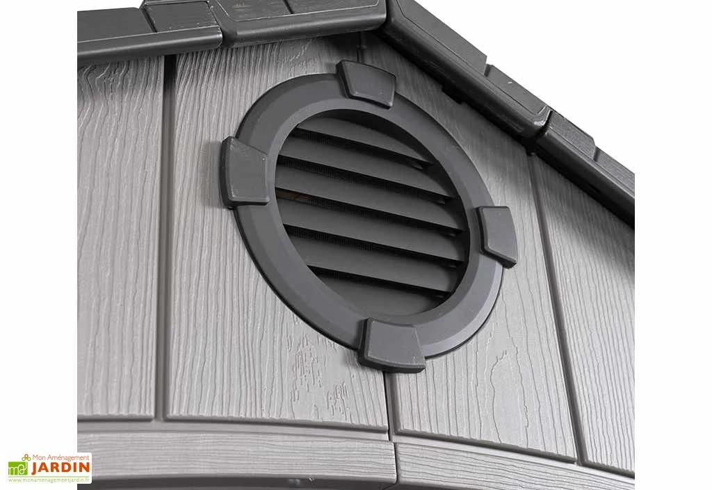 Cet abri de jardin de la marque Lifetime est doté de parois en polyéthylène haute densité (PEHD) à la finition effet bois, pour faciliter son intégration dans votre extérieur. Il se montrera ultra robuste, notamment face aux intempéries et autres menaces telles que les insectes ou la moisissure, le tout sans exiger d’entretien particulier. Traité anti-UV, il ne décolorera pas au fil du temps et sa grille d’aération assurera une bonne ventilation intérieure afin de vous garantir de bonnes conditions de stockage. Cet abri en résine vous offre donc l’esthétique et la solidité du bois, l’entretien en moins !