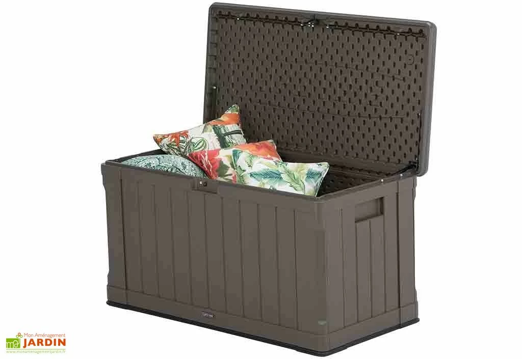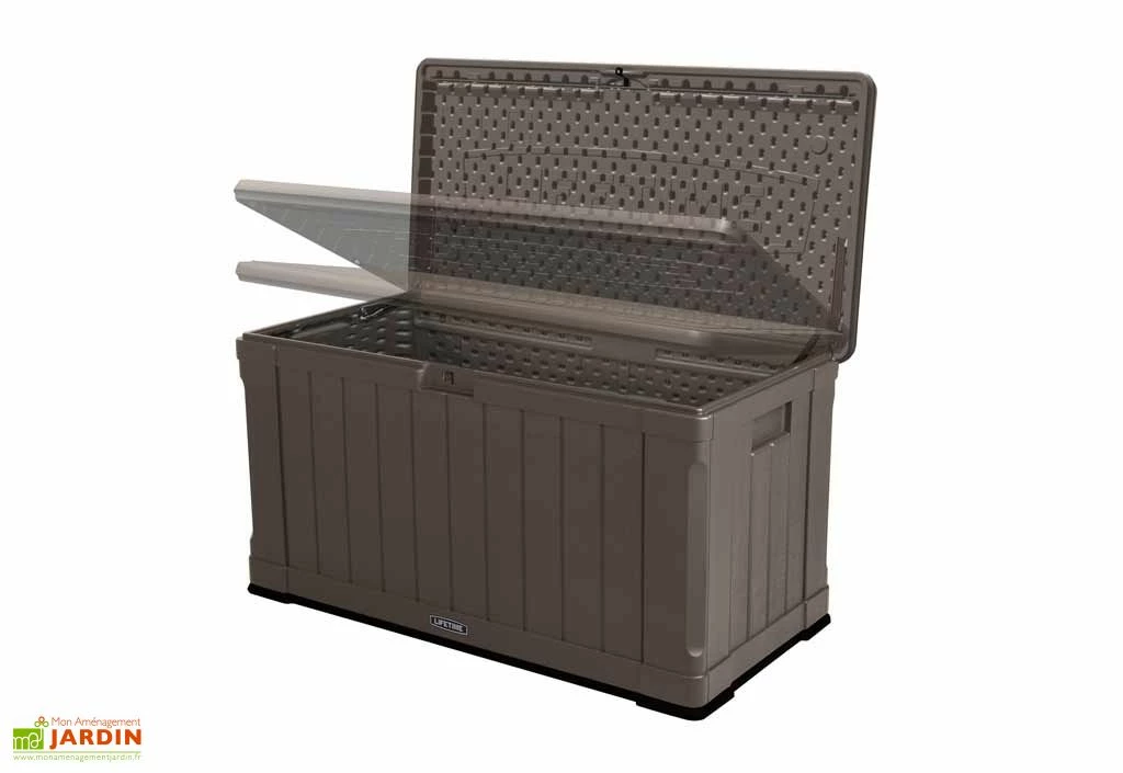 Votre coffre de rangement en polyéthylène haute densité de chez Lifetime est un coffre très robuste avec doubles parois pouvant aussi être utilisé comme banc de jardin. Parfait pour stocker vos affaires extérieures à l’abri des intempéries. Etanche, votre coffre est aussi résistant aux UV, il ne jaunira pas et ne se décolorera pas. Des poignées de transport sont moulées dans les parois pour faciliter le déplacement. Le couvercle est muni d’une charnière à ressort et s’ouvre à plus de 90°. Pour plus de sécurité, vous pourrez vérrouiller votre coffre (cadenas non fourni). Sa grande capacité de 439 L vous permet de stocker un certain nombre d’objets. Votre coffre mesure 128,9 x 64,5 x 67,8 cm (l,l,h) et est de couleur marron foncé avec un fond noir. Son look imitation bois permet de l’intégrer facilement sur une terrasse ou dans un jardin. Très facile à assembler et ne nécessitant aucun entretien, votre coffre imputrescible est garanti 10 ans.